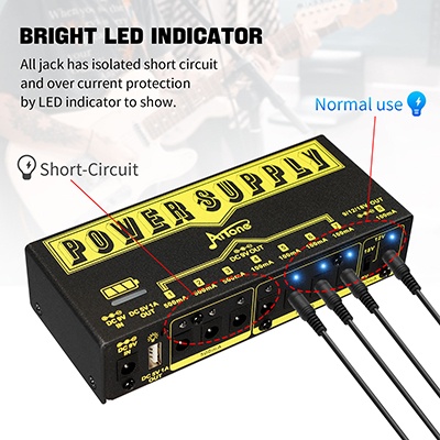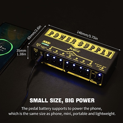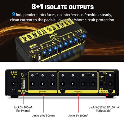 AITONE Pedal Power Supply 9V 12V 18V Rechargeable Battery Guitar Pedal Board with 8 Isolated DC Output USB Port 100/500mA